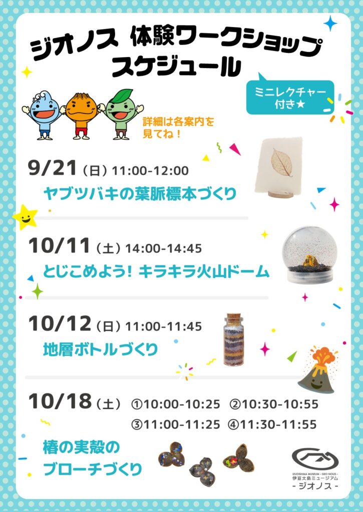 おすすめ 伊豆大島ジオパーク📢 ジオノス 体験ワークショップ スケジュール 🎉 学んで楽しむミニレクチャー付きワークショップです。世界にひとつだけの作品を作ってみませんか? ご参加をお待ちしております! ■9/21(日)11:00-12:00 ヤブ […]
