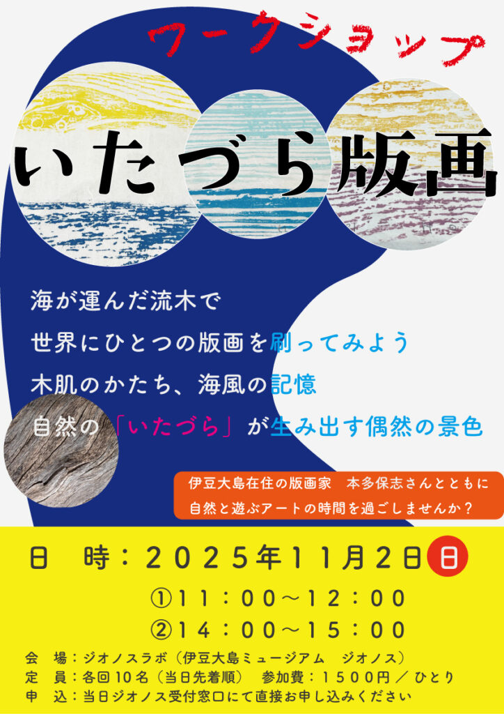 おすすめ 伊豆大島ジオパーク体験ワークショップ『いたづら版画』 海が運んだ流木で世界にひとつの版画を刷ってみよう木肌のかたち、海風の記憶自然の「いたづら」が生み出す偶然の景色・・・ 伊豆大島在住の版画家 本多保志さんとともに自然と遊ぶアートの時間を […]
