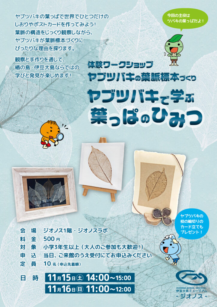 おすすめ 伊豆大島ジオパークヤブツバキの葉っぱで世界でひとつだけのしおりやポストカードを作ってみよう!葉脈の構造をじっくり観察しながら、ヤブツバキが葉脈標本づくりにぴったりな理由を探ります。観察と手作りを通して、椿の島・伊豆大島ならではの学びと発見 […]