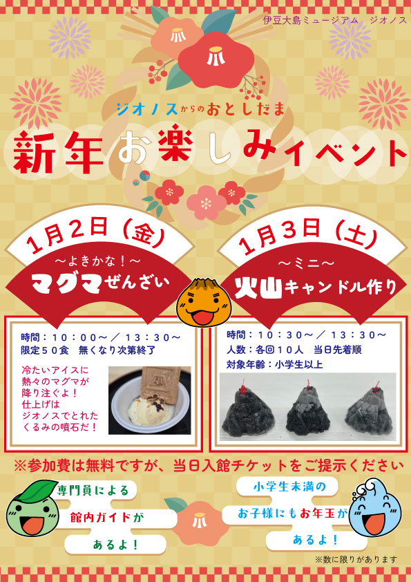 ほかにも、ジオパーク専門員による館内ガイドや、「ミニ火山キャンドル」づくりに参加できない未就学児のみなさんには気持ちばかりですが「お年玉」(※数に限りがあります)をご用意して皆様のご来館をお待ちしています!